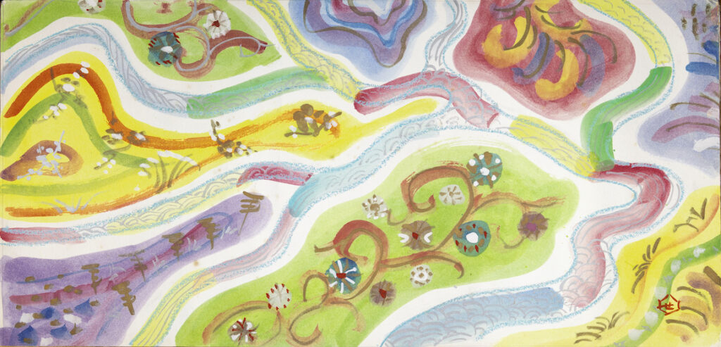 約500人収容のホールに設置された緞帳(ステージ幕)は、幅が13.2m、高さが6.5m。抽象絵画のようなカラフルな絵柄は、人間国宝の芹沢銈介が原画を描いた。「陽に萌える丘」と名付けられたその原画には、流域の人々に大いなる水の恵みを与えてきた鶴見川と、その水からたっぷりの栄養を得た大地に強く繁る草木や花々が描かれている。